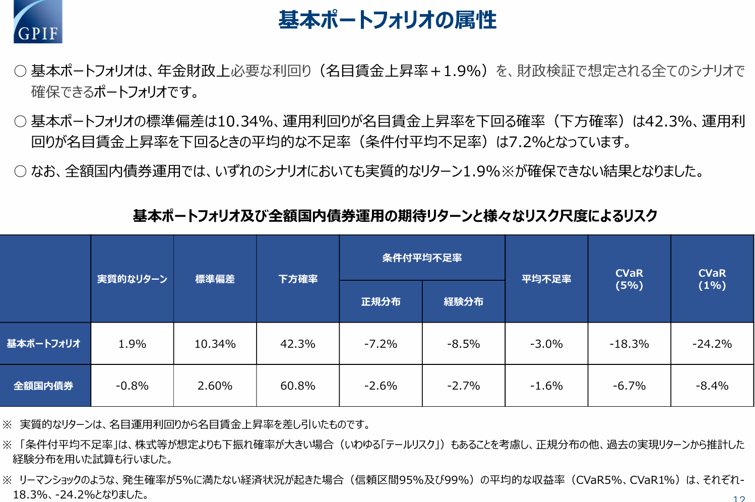 また、参考までに上記の図にある通り、GPIFは決定した基本ポートフォリオと、全額国内債券のポートフォリオを比較しています。GPIFは結論として、色々な財政のシナリオで検証したところ、国内債券100%のポートフォリオでは目標リターンを確保できないと明記しています。