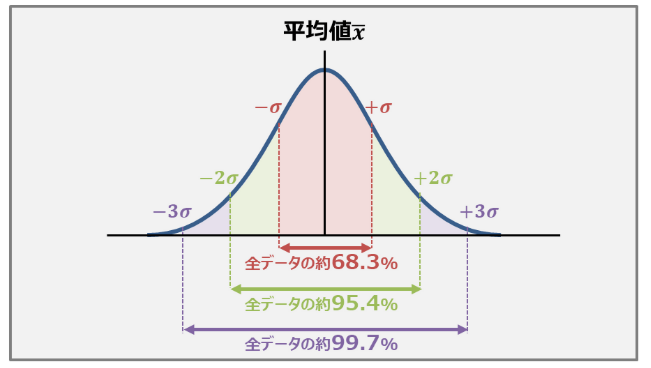 標準偏差には、標準偏差1、標準偏差2、標準偏差3・・・のように標準偏差自体が一つではなく、データの範囲に差があります。