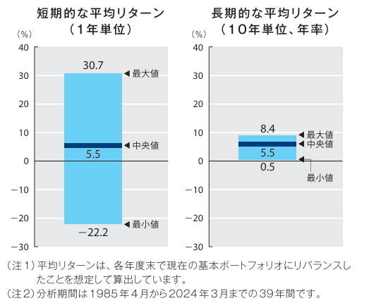 またGPIFは過去の政策ベンチマークデータを用いて、基本ポートフォリオで運用した場合の短期的なリターン(1年) と長期的なリターン(10年)の分布も確認しています。