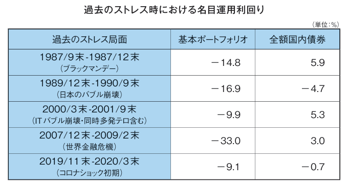 基本ポートフォリオによる運用の場合、一時的に生じる損失としてはリーマンショックが最も大きく、-33%となりました。一方、全額国内債券運用の場合には、一時的に生じる損失としては日本のバブル崩壊が最も大きく、-4.7%となっています。