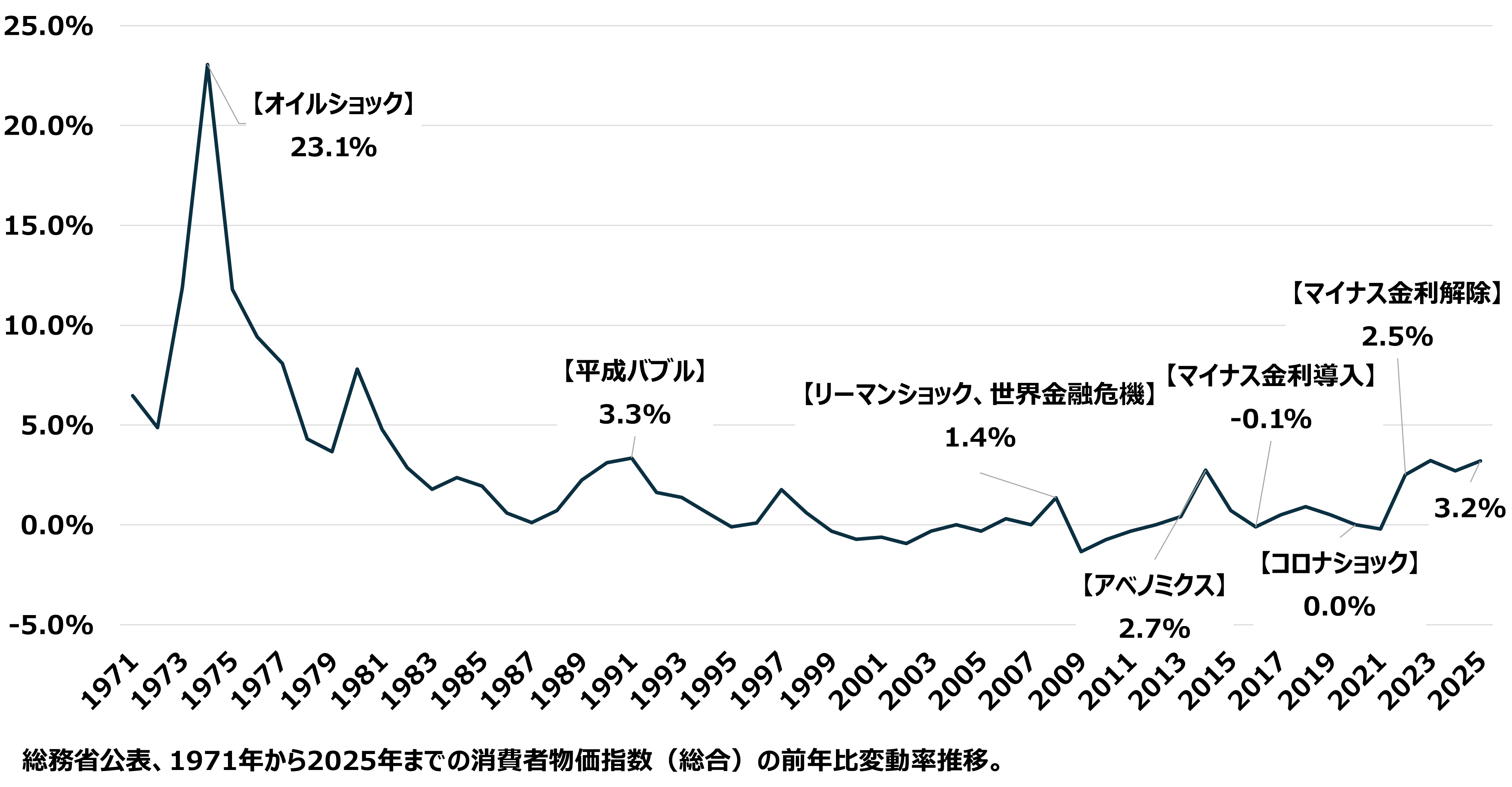 先月末、2025年の年間での物価上昇率が、総務省より公表されました。指数(総合)で前年比+3.2%(そこから変動の大きな生鮮食品分を除くと+3.0%、さらにエネルギー分を除くと+2.9%)と、昨年、一昨年に続き、年間3%前後の物価上昇という結果となりました。
