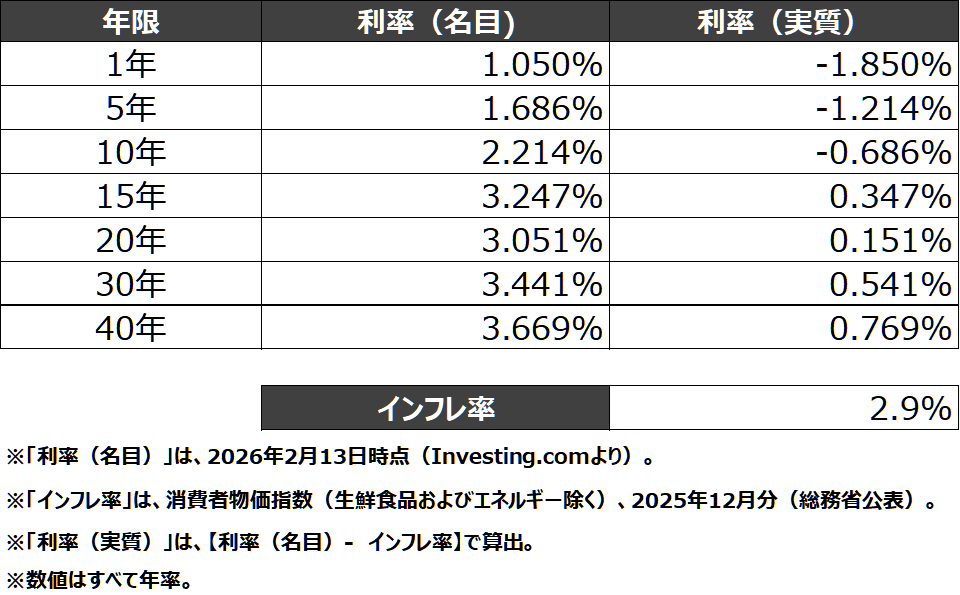 このようなインフレの時代では、公益法人の多くが当たり前にとってきた債券による運用という手段についての、これまでであれば見えづらかったリスクが顕在化します。 下の表は、2026年2月13日時点の日本国債各年限の利率を、「名目利率」およびそこから物価上昇率を差し引いた「実質利率」に分けてまとめた数値を示しています。直近、報道などでも日本国債の金利上昇に伴う投資妙味の高まりといった話が聞かれるようになりましたが、表の通り、実は「実質利率」は15年物の国債にしてようやくプラスになる状況なのです。