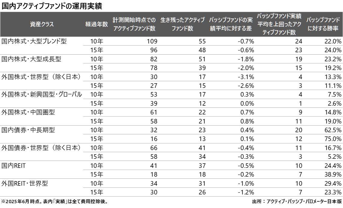 本レポートの特徴は、ベンチマーク指数そのものではなく、実際に購入可能なインデックスファンドと、アクティブファンドの実績を、いずれもコスト控除後のリターンで突き合わせている点にあります。つまり、理論上の指数連動リターンとの比較ではなく、より現実的・実務的な視点から成績の良し悪しを測定したものなのです。